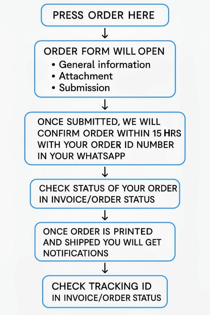 *3. Large File Handling: If any of your files exceed 20 MB, we recommend resizing them for attachment. Alternatively, you can send larger files via our WhatsApp number for efficient transmission. Please ensure to fill up the Order Form - General Information part on our website before submitting your documents via WhatsApp.